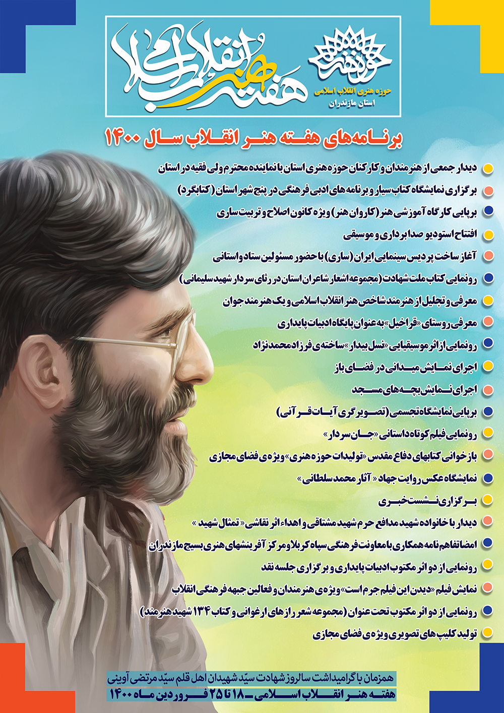 وی در پایان گفت: رونمایی از تولیدات هنری در رشته های مختلف، فعالیت های نمایشگاهی، تولیدات مجازی، دیدار، اجراهای ترکیبی، مفهومی و نمایشی فضای باز، فعالیتهای عمرانی ( کلنک زنی پردیس سینمایی ایران و تجهیز استودیوی صدا و موسیقی) معرفی و تجلیل چهره های هنری از اهم برنامه های هفته هنر انقلاب امسال حوزه هنری مازندران خواهد بود.