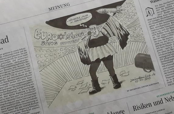 در این کاریکاتور نتانیاهو در حالی دیده میشد که برنده مسابقه « یورو ویژن 2018 » شده است و در عین حال موشکی که بر روی آن علامت ستاره داوود وجود دارد را در دست دارد و میگوید: «سال آینده در اورشلیم (بیتالمقدس)» همچنین در عبارت Eurovision هم به جای حرف v از ستاره داوود استفاده شده است.