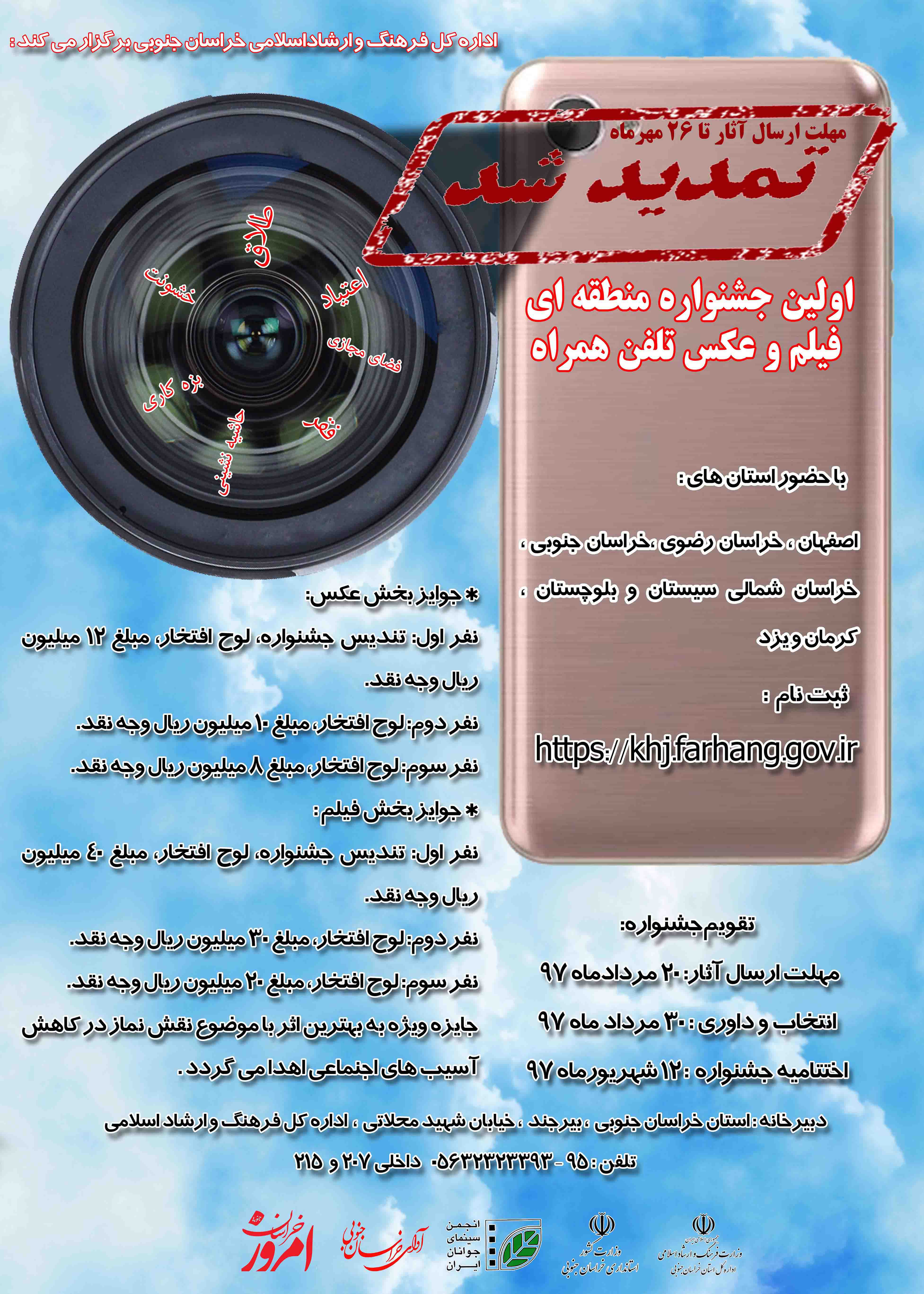 به گزارش پایگاه اطلاع رسانی حوزه هنری خراسان جنوبی،اولین جشنواره منطقه ای فیلم و عکس تلفن همراه خراسان جنوبی توسط اداره کل فرهنگ و ارشاد اسلامی خراسان جنوبی با حضور استان های:اصفهان،خراسان رضوی،خراسان جنوبی،خراسان شمالی،سیستان و بلوچستان،کرمان و یزد با موضوع آسیب های اجتماعی (طلاق ، خشونت ، بزه کاری ، حاشیه نشینی ، فقر ، فضای مجازی و اعتیاد) و در دو بخش عکس و فیلم برگزار خواهد شد.