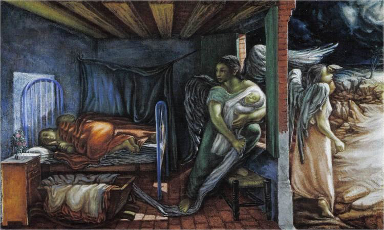 برای"خولیو کاستلانوس"، مرگ کودکان فقیر واقعه ای هر روزی است. از دوران پیش از ورود اسپانیایی ها، مرگ به عنوان بخشی از زندگی بزرگ داشته می شد؛ و با مذهب کاتولیک فرشته ها نیز آمدند، به طوری که حتی فرشته مرگ، که در این جا دیده می شود، بیشتر به چشم فرشته نگهبانی نگریسته می شد که روح را به بهشت باز می گرداند.این نقاشی مثل صحنه ای از نمایش است؛ فضای اطراف هم نوعی صحنه آرایی است. صحنه با یک دیوار به دو بخش تقسیم شده است. از پنجره فرشته ای پا بیرون می گذارد، و با این کار زندگی بیرون را به عرصه اصلی واقعه در داخل پیوند زده است.
